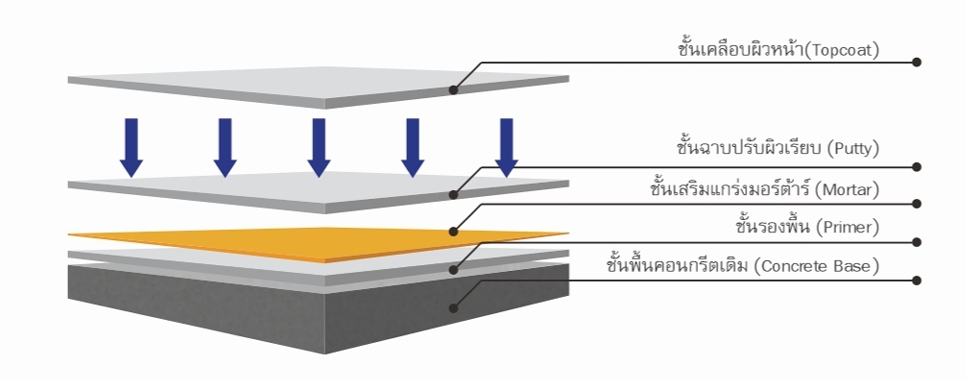 1. การเตรียมพื้นผิว (Surface Preparation) : ตรวจสอบสภาพพื้นผิวเดิม จากนั้นดำเนินการขัดพื้น ซ่อมแซมรอยแตกร้าว และทำความสะอาดกำจัดฝุ่นให้เรียบร้อย
